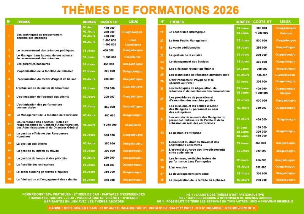 Le Cabinet HOPE Consult SARL propose un ensemble de formations spécialisées destinées à renforcer les compétences des professionnels et à accompagner les entreprises dans le développement de leurs talents. Grâce à une équipe d’experts en Droit des Affaires, Fiscalité, Finance Bancaire, Comptabilité, Audit et Ressources Humaines, nous offrons des programmes de formation pratiques, structurés et adaptés aux réalités du terrain. Notre démarche repose sur une pédagogie moderne, orientée résultats, permettant aux participants d’acquérir des compétences immédiatement opérationnelles. Que ce soit pour maîtriser les enjeux juridiques, optimiser la performance financière, améliorer la gestion du capital humain ou renforcer la conformité réglementaire, HOPE Consult SARL met à votre disposition des formations sur mesure, conçues pour faire évoluer votre organisation et valoriser vos équipes. Notre engagement : vous fournir un apprentissage de qualité, assuré par des formateurs passionnés et expérimentés, afin de garantir un impact réel et durable sur vos activités.